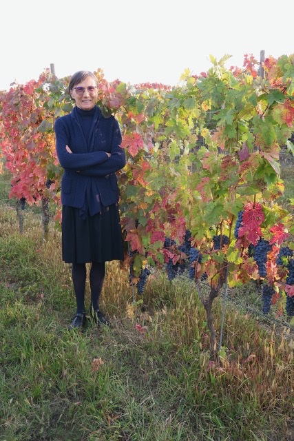 Our hostess is an institution – having rescued the very minor grape variety Uvalino and re-instated it successfully – and despite being dressed like a nun, she joined in on the big bench for a photo with Valentina and me.
