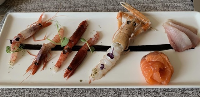We returned at 17.30 to La Romana to meet a journalist that Valentina knows, and David was interviewed in Italian for half an hour. Valentina then joined us for supper at the Piccole Torre, introducing us to their wonderful raw fish starter – and a strange, over-oaked Chardonnay from Umbria which appears to be a great favourite of hers…