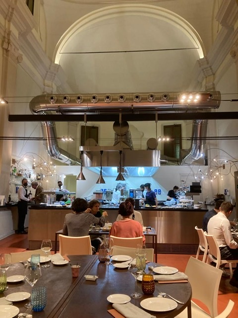 Supper was at Sara Ghisolfi on piazza Guilia beyond the duomo, booked by our lunch time host. A converted church – stylishly done with vast stainless steel tubes taking away the kitchen smells in the open plan nave (reminiscent of River Cafe but smaller and very stylish!) Elegant and contemporary – finger food starters; pigeon done perfectly and a v superior pasta and faggioli. We went back to our room needing to do an hour’s preparation for the next day despite feeling very tired.