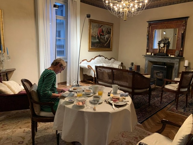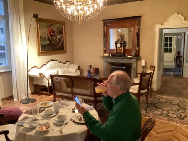 As we had not yet been near Tortona she kindly led us to via Montebello to park nearby the very stylish B&B Villa Sironi. Formerly the residence of a prominent silk manufacturer called Setoria Sironi it is a very fine town house – elegantly furnished in sophisticated traditional style in keeping with its architecture – available to all (see website) at reasonable cost, maintained by a charitable Fondazione and used by the consorzio and other businesses.