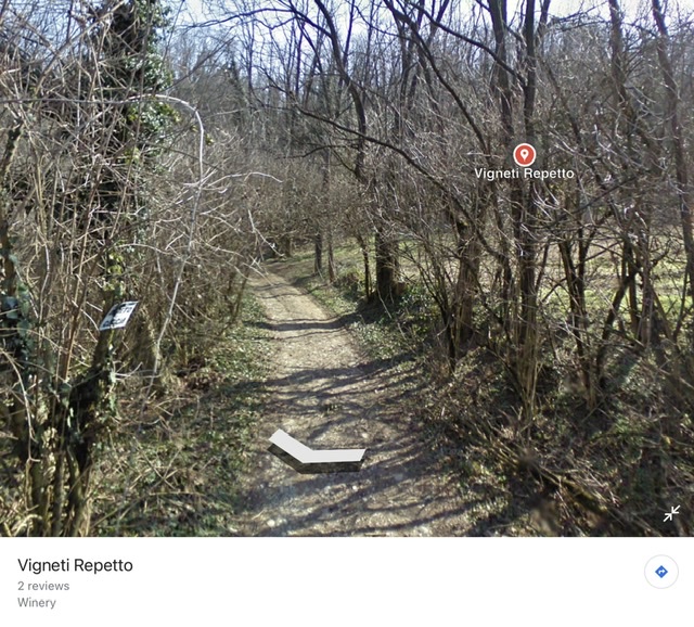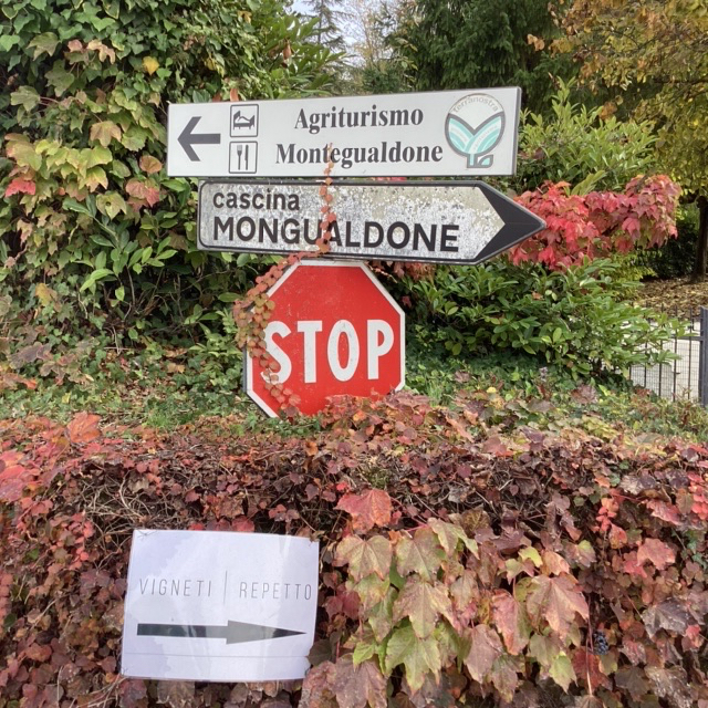 We were saved by a workman who told us we were ‘seriously lost’ so we needed to go round the hill – sempre destra… o sempre sinistra… (non importa). His saving idea was to go to the agriturismo Montegualdone to where the old winery had been. As we approached it, by a happy chance I noticed an A4 sheet of paper with Vingneti Repetto flapping from a fence. Two in fact… but very small…
