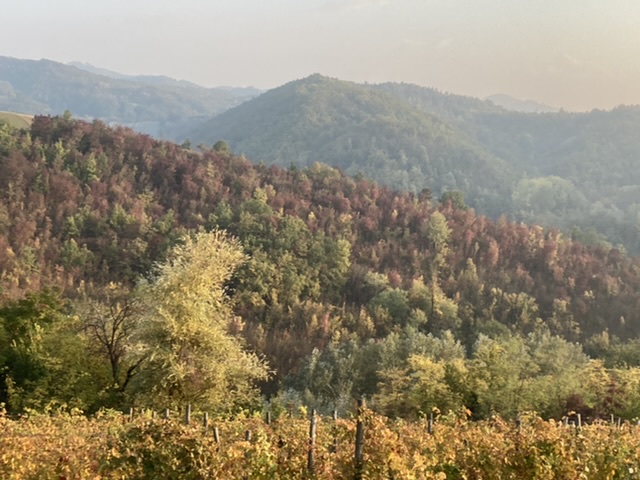 We tried to catch the beautiful autumn light from the balcony over the almost monopole (single, continuous vineyard) where vines and forest are turning golden; orange and red.