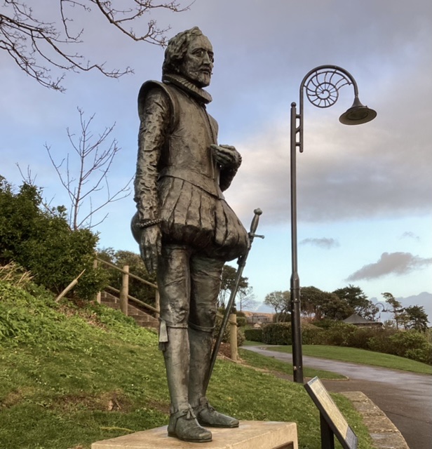 Mary Anning is not the only celebrated person from the past. Sir George Sommers, who in 1606 discovered uninhabited Bermuda, was rewarded by the king for his loyalty with land and property in and around Lyme. His is a statue that may survive the current iconoclasms; he died in 1610, on Bermuda, and before any suggestion of colonisation or slave-trading. He looks out over the Cobb from his plinth: