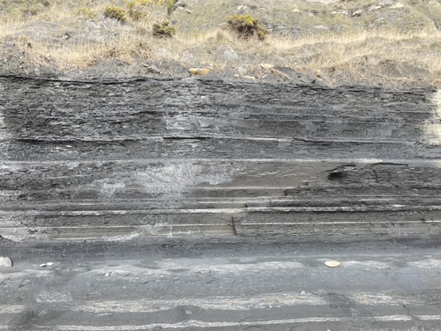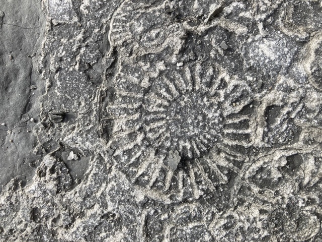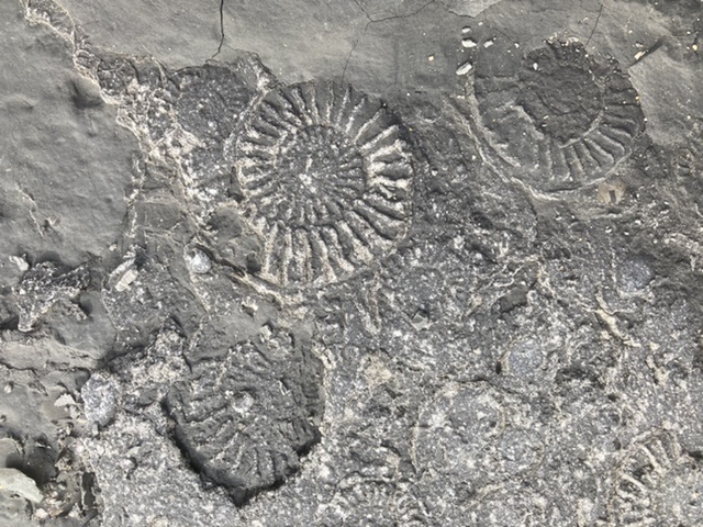 We passed one of the many disintegrating soft cliffs which now attract zealous fossil hunters of all sizes and seriousness. Large cobbles and boulders which smother what sand occurs made for very slow progress. Great slabs of shale littered the beach, many bearing the signature ammonite impressions. Every child we met had found one or two to take home. Mary Anning would have been proud.