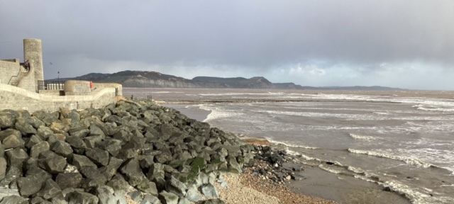 The next day promised dry weather and a favourable midday low tide which allowed us to walk east at the sea’s edge from Lyme to nearby Charmouth, leaving the town via the new, impressive sea defences.