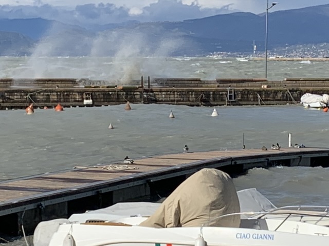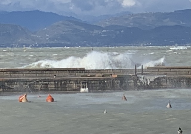 Having returned the bikes, we walked back along the main route through the town along which all the through traffic crawls, day and night. In contrast to the previous calm evening, the lake was boiling, whipped up into lively crashing waves, causing the small vessels moored in the modest harbour to bounce and buckle in the gale.