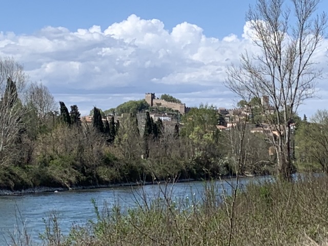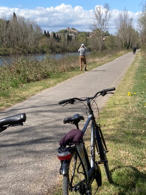 We had Saturday to relax, and David had pre-booked bikes for us to cycle the E6 route south from the lake along the river Mincio. Given time and energy, Mantova is within reach (45 km) but we travelled as far as Pozzolo, first passing through the very impressive fortified viaduct of Valeggio. This destination ristorante town is where most cycling families’ journeys appear to start or finish