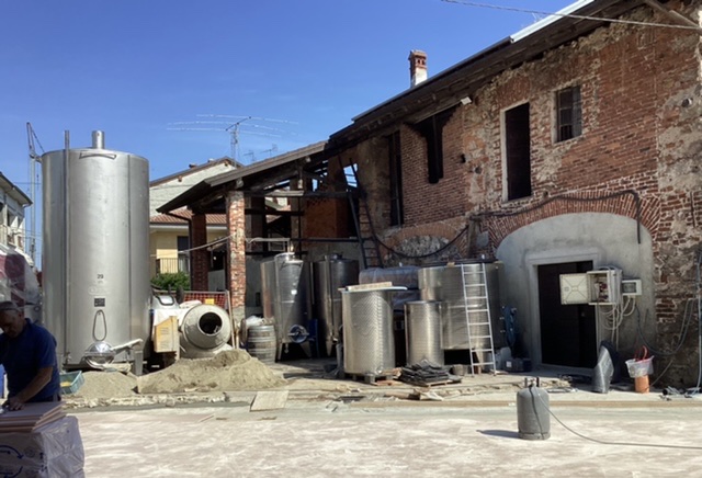 He showed us the very orderly ranks of his newer vineyards, where we could see the tiny Nebbiolo grapes beginning to form with their characteristic wings/shoulders/ears near the stem which are sometimes removed, and then took us to his Cantina – now being extended and reconstructed.