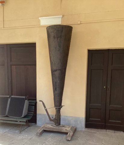 On to the family summer Villa at San Sebastiano allo Zoppo where the hill on which it sits enjoys a mediterranean climate partly owing to its southern aspect and its particular conical shape; sandy soil, fast draining, and low in macro elements, with milder winter temperatures. The old cellar spaces remain beneath the house, and the family use it for a focus for their meetings; the vertical canon is an early (and not very successful) technology developed to disperse hailstorms… It’s big!