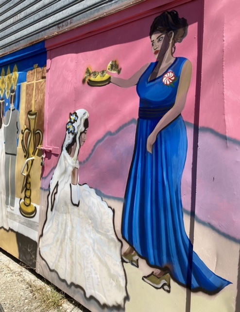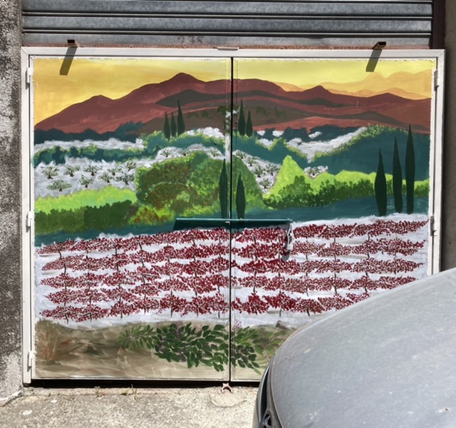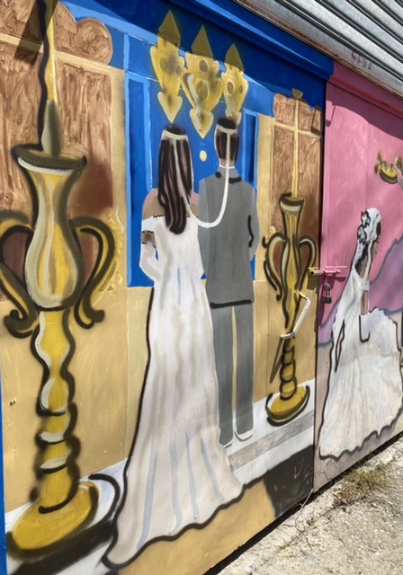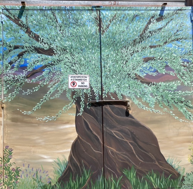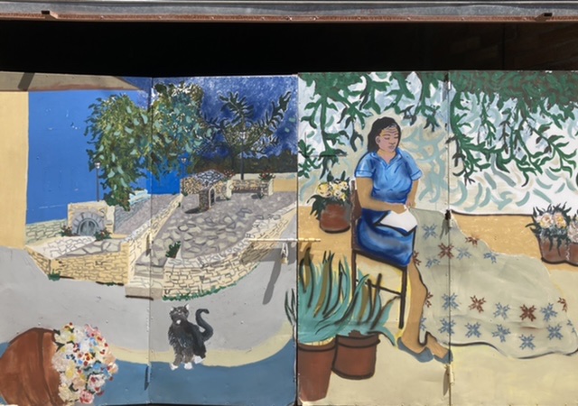Wandering around some of the back streets, we came across this series of murals, painted on the doors of lock-up garages (note the signage) : striking representations of aspects Cypriot life.