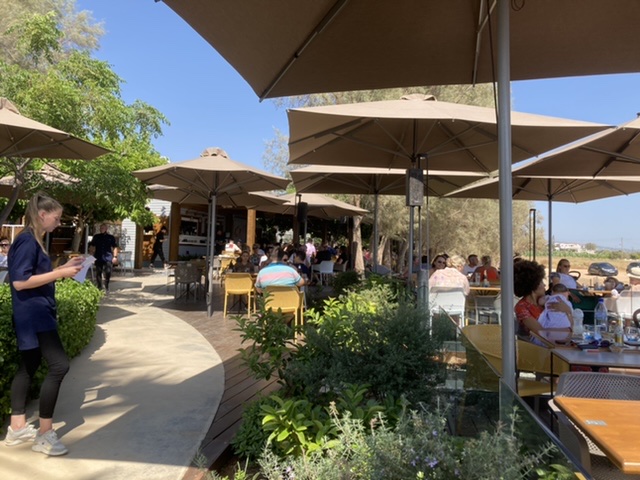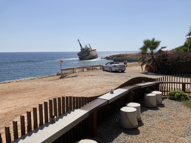 The next day we drove south towards Paphos, before turning east for Coral Bay where friends were already ensconced for the first of the wedding events to be held at the Coral Bay Resort Hotel. En route we called in at Fikardis, and met Fikardis Fikardis (yes – think Gaia Gaia!) who is developing his father’s winery, based in the commercial sprawl to the north of Paphos. He recommended Oniro, where we ate twice – a fabulous restaurant overlooking the sea, with its very own wreck.
