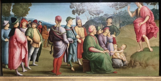 The following religious pieces were painted between 1506 – 8, probably in Florence and possibly Rome as Raphael’s fame spread, though the first, of John the Baptist preaching was part of an altar piece in Perugia created in 1505 for the Ansidei family (note the playful toddlers, stage right).