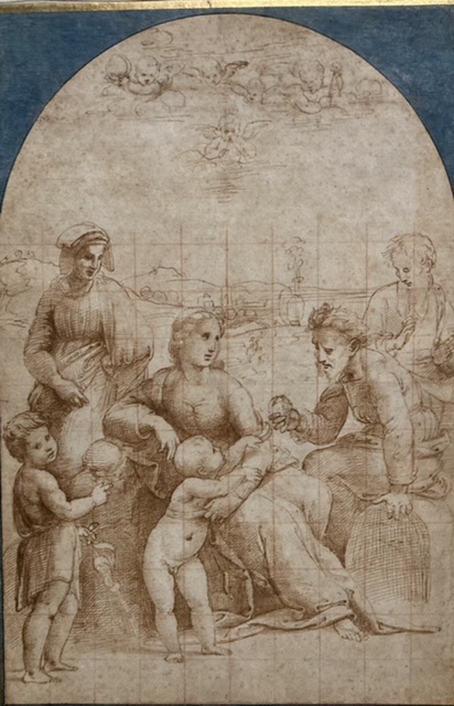 There are echoes of Leonardo da Vinci in several of these early works (eg the Madonna of the Pinks, also in Leda, above), and as Raphael experiments with forms, light and shade, his distinctive genius emerged. The Tempi Madonna exudes maternal love, as well as a wistful (proleptic?) infant’s gaze. The Holy Family plus Pomegranate drawing was a gift sent from Raphael in Florence to Domenico Alfani in Perugia and used by him as the basis of an altar piece there in 1510.
