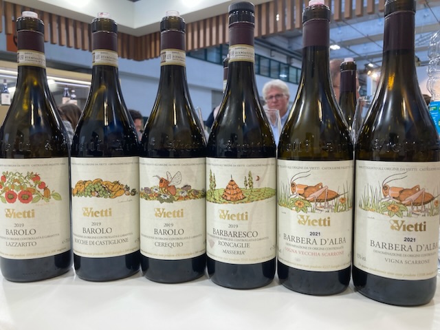 We managed to track Stefano Chiarlo down in Pad 7, surrounded by keen customers and clients before a meeting at 14.00 Piazzo Armando with Simone back in Pad 10, followed by a chaotic session with Silvia Bargalia in Pad 9. The high spot of the afternoon was 90 minutes with the very able wine maker Eugenio Palumbo at Vietti back in Pad 10, tasting with him while admiring Gianni’s labels, still in use. Walter Massa arrived as if summoned as we talked about Vietti’s excursions in Colle Tortonese, and once encouraged to speak italian he stayed, sending his assistant to fetch 2013 Timorasso. Fascinating!