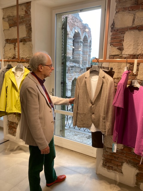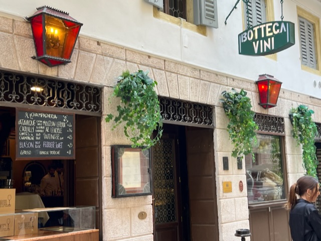 The fifth floor room delivered exactly 100 steps each way. The rest of the day’s steps were performed in gentle passegiate as David majored on shopping (Falconiere) before a pre-booked lunch at Botteca Vini, more strolling and a late afternoon zizz before setting off for Veronetta and the familiar Du Schei for supper (which we learned had changed hands since our last visit, and the reasonable Montevertine bottles had disappeared. We turned down the remaining €120 version)