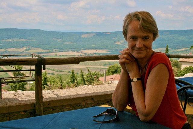 We ate slowly (it was busy – and carefully as David was still under the weather) at Le Mura where we had our first ever meal in Massa Marittima in 2007 with Vanessa from the British Institute of Florence as part of the Summer school. The photo below was taken there in 2009 a much younger Janet; once again watched the sun go down over the hills.