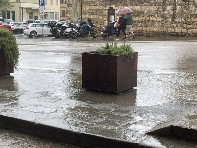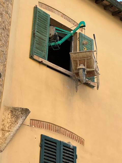 We walked up the short hill in the sultry, warm evening into the busy streets teeming with August holiday makers, noting the expansion of some familiar businesses and the decline, even absence of one or two (the in-town hotel Il Sole, and the Mura Antiche ristorante below the Duomo), and, typically savvy, a wheelbarrow suspended out of harm’s way.