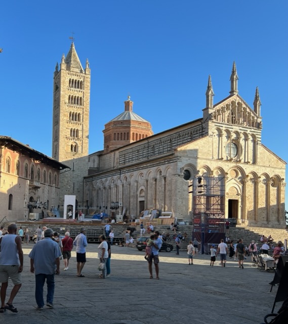 The weather disappointed many! Coats and jackets were very much in use by the holiday makers as we strolled to the Seminario, then past the bars on the busy top road to the Piazza 24 Maggio, past the museo and the Augustinian cloisters, and La Fenice, the former hotel, now apartments. We made our way through the back streets and to the far side of the cathedral, gradually losing height and recalling former days of Calice di Stelle (glasses under the stars – a wine festival) until we reached the bookshop, where we lurked for 15 minutes. The main square was – of course – closed off by 20.00 for tonight’s Opera.