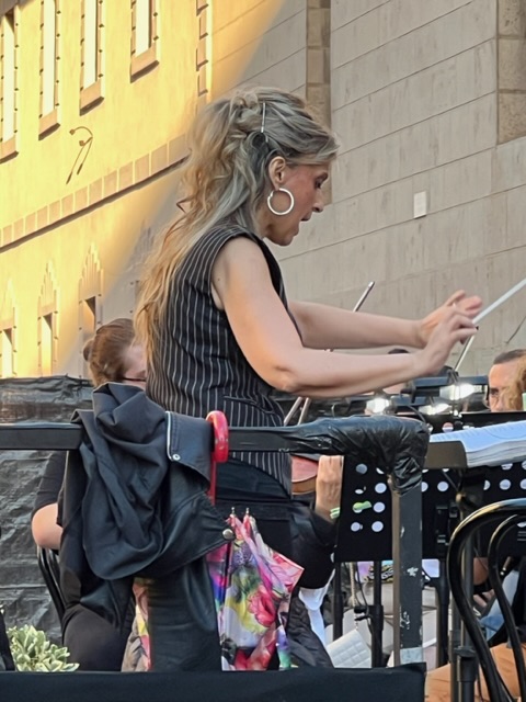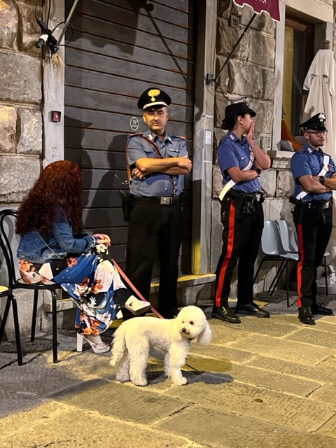 Tonight we eat at La Tronca, and then tackle The Barber of Seville. It was a dry evening mercifully, as we ate in the alley now put to good use to increase covers. In fact we had seen and heard some of the rehearsal during the afternoon, and particularly enjoyed the woman conductor’s contribution who also provided keyboard support during the performance itself. The audience was diverse – though the dog looked slightly less engaged than the community police…