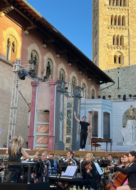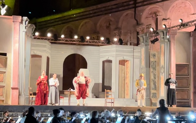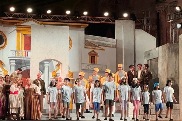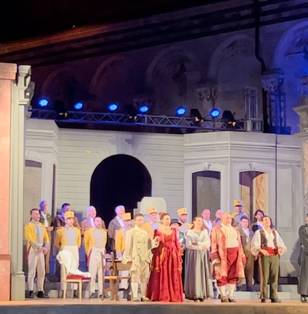 We ate, as many times before, in Grassini’s ristorante right next to the entrance to the square in which the Operas are performed. (this is largely strategic: it has the nearest loo (though one has to learn the knack of flushing it) so retaining a third of the bottle for consumption in the interval is vale la pena! – worth the trouble!) As ever there was consternation about restrictions (the area needs to be cleared by 20.00) and tensions mounted as time passed. It is all part of the experience…