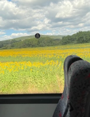 The sun had returned with a vengeance, and the bus route to Follonica was bordered by fields green from the recent torrential rain, and some parched from the blistering heat of three weeks ago. The short-stemmed sunflowers flourished in vast fields alongside the road.