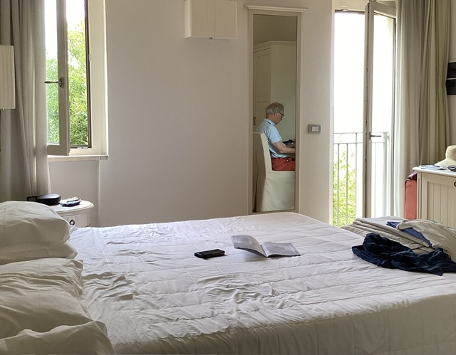 This was the most extraordinary day for its ordinariness – at least here in Italy – where David spent the whole day checking the remaining 330 pages of the book, making last-minute changes, selecting b&w versus colour photos, and re-writing the cover blurb, and adding the gorgeous grapes photo to the cover. I read the rest of Cesare Pavese’s famous short, sad and rather depressing novel – A beautiful summer – begun in Peschiera in April; then virtually wrote up the whole of this holiday’s blog (never normally achieved for weeks!) The air-conditioned room made a brilliant office, and the corrections were dispatched at 17.19 (BST). Rebecca Clare now has a working day to process it all! Such a relief…
