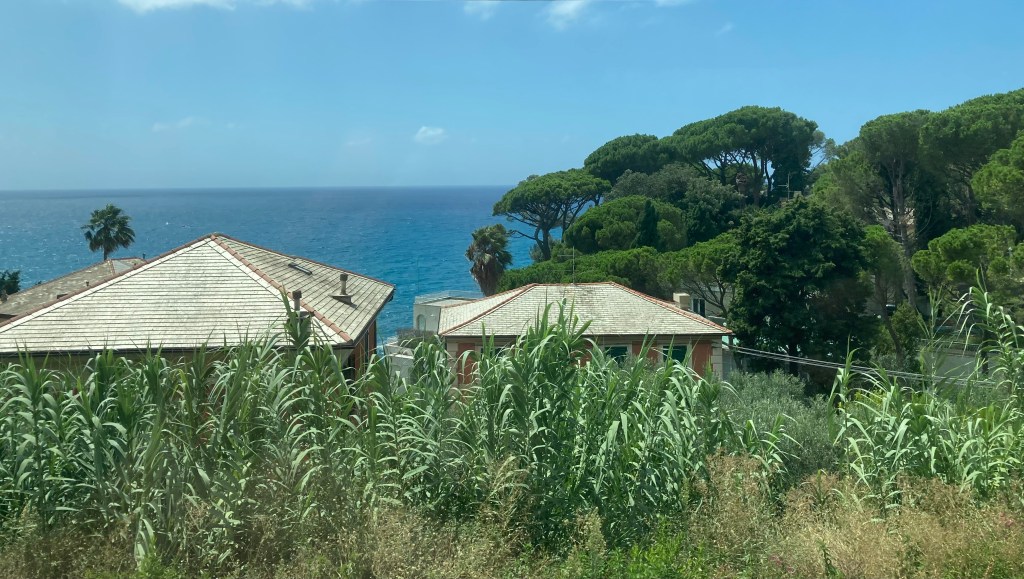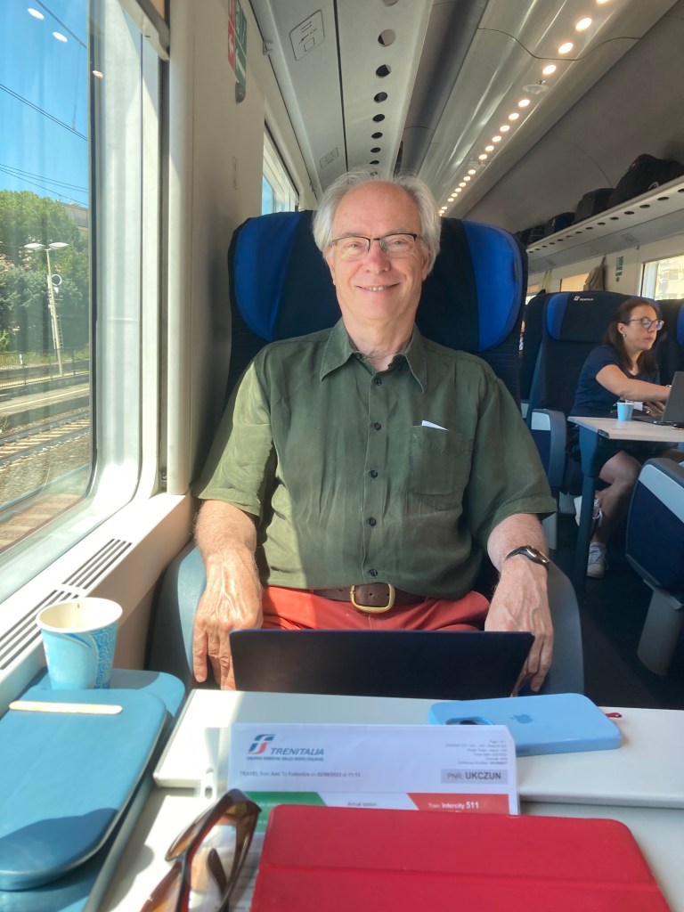 I had been apprehensive about this journey; what if …. there’s no air-conditioning; …the mosquitoes are bad; …the loos don’t work; …it doesn’t arrive… and so on. In fact first class tickets at no great expense – less than €40 to travel 370km – guaranteed excellent seats, cool air, and working facilities, and more or less ran to time. The long journey was timely; David had received his final instructions from the book’s editor – a final check of all the previous corrections as well page layout, and decisions about photos and maps – all needed by Friday when it goes to the printers! As we travelled down the coast of Italy he solemnly viewed the first 80 pages.