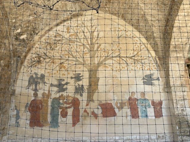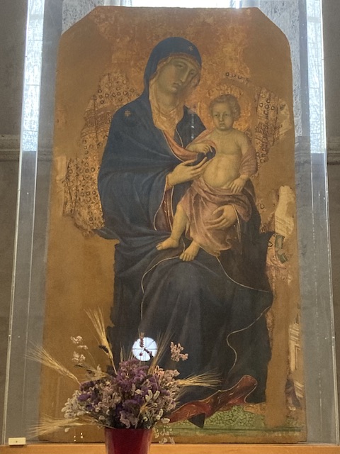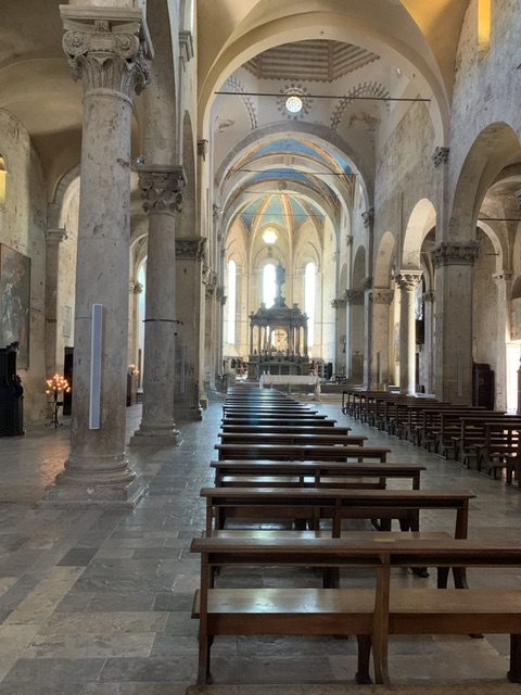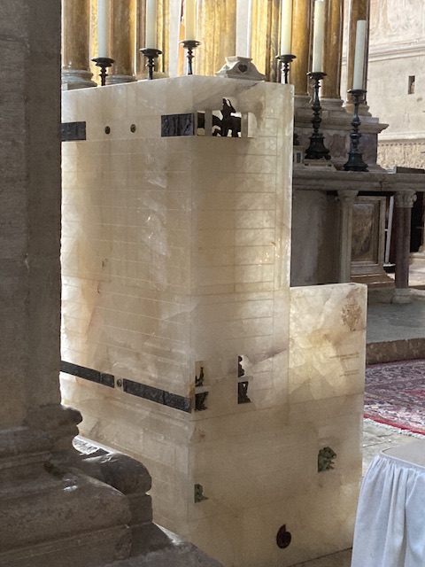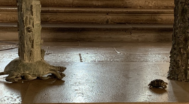 But first we paid our respects to San Cerbone, bishop of Populonia from 570 – 573 CE in the Cathedral. (See slideshow above) It is graced by the thirteenth century font (1267) in which San Bernardino was baptised on 8 September 1380; a sixteenth century oil painting with a very scary cat; a majestic almost translucent cathedra decorated curiously by miniature scenes of rural life; (look carefully on the second pic of this to see David gimbling); San Cerbone’s beautiful tomb carved in the eleventh century, which still stands behind the High Altar, bearing images of the stories associated with him:eg the speaking geese; a Maestà by Duccio, painted in 1316. A full view of the interior precedes the tartaruge – (tortoises) who still patiently support the altar.