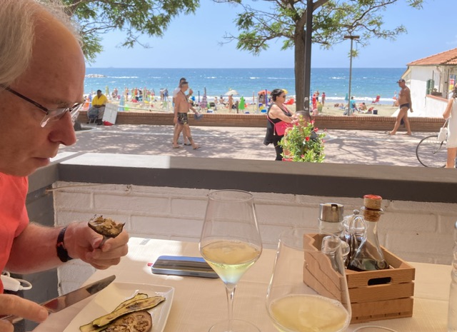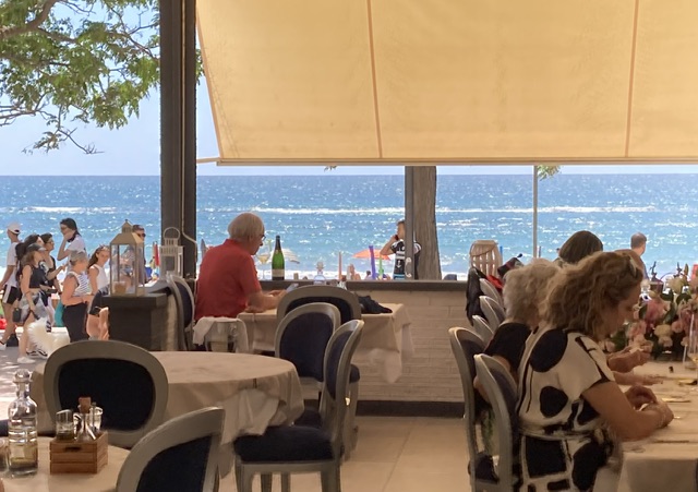 Follonica is a lively if ordinary seaside town, looking prosperous and busy on a hot sunny day. We arrived at the station stop, and walked straight down to the seafront which was already teeming. The Italian tradition of private beach stands dominates, where one pays for a fixed posto and enjoys the close company of friends and family beneath large umbrellas basking on the provided loungers. On the other hand there are several areas of ‘free’ beach, where the orderliness gives way to greater spontaneity. Lunch in the Palazzo Tre Palme was twenty metres from the beach – delightful setting and a wonderful bottle of Ferrari to accompany delicious food.