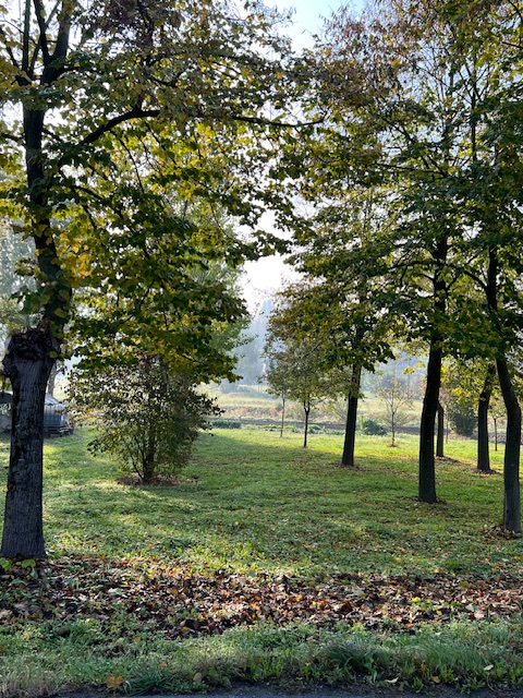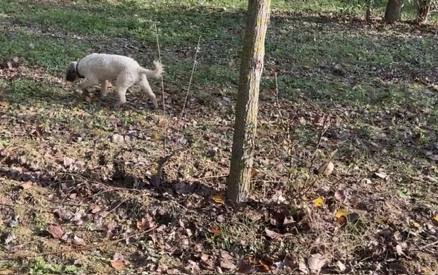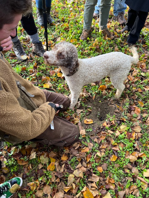 The bus collected us from the main Piazza, (the group split between those who had spotted the bus some 100m away, and those waiting patiently at the appointed place) and we arrived at the truffle ground in no time – a small, airy copse, planted perhaps thirty years ago with Linden, Oak, Hornbeam, Poplar, Willow and the odd Hazelnut – all of which keep close company with truffle spores. It was opposite a row of comfortable houses on the very edge of town.