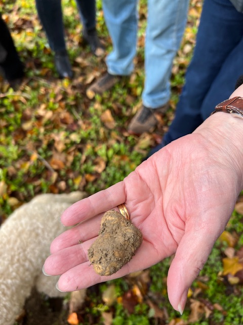 Leah, a two year old recently trained by her young master ( who instructs skiers in the winter months) did a very good job of nosing out five smallish truffles (total weight 110gms and worth 300 euros) and drew a great deal of devotion from the dog-loving attendees. Having watched the process carefully, I began to surrender my scepticism; the dog did a very good job! (NB: Valentina was adamant that these were planted!)