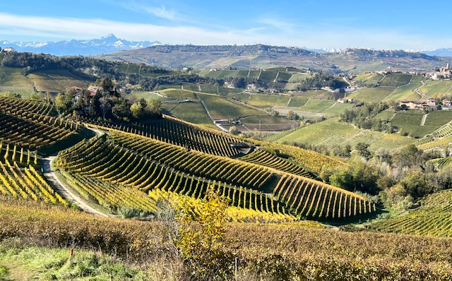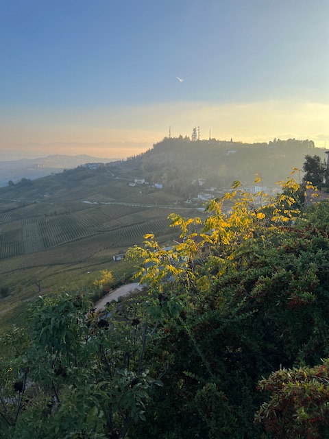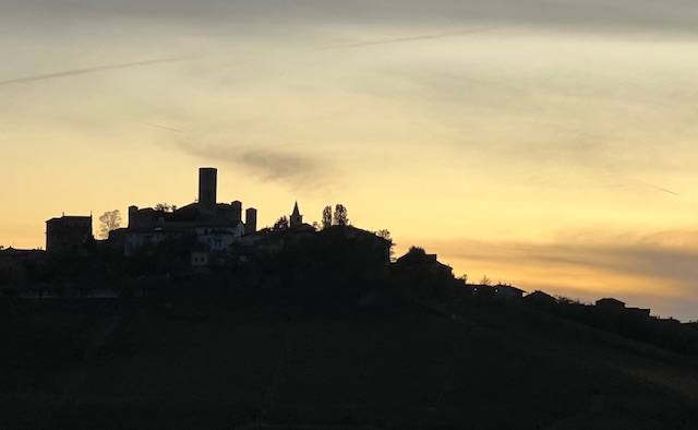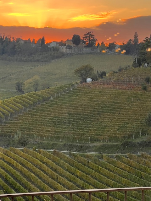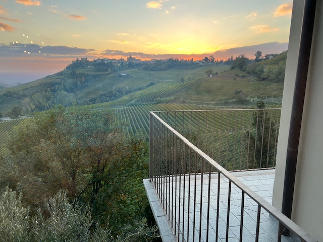 Next stop: : a very sickly hot chocolate (con panna) for everybody – it had suddenly turned cold as the sun went down – after which we stepped off the main street and into Rocche Costamagna where our host, after a short delay, showed us the very long family wine-making history and provided a tasting in a room alongside the balcony with almost as good a view; slightly north-east, and including Alba.