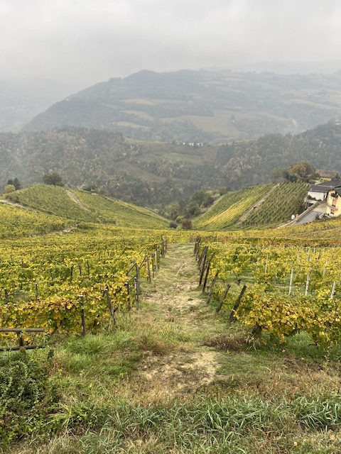 Of course, we ran late; arriving in the rain and mist at Azienda Agricola 499 at least 40 minutes late to be treated to fantastic views of mist-clad steep slopes and a rapid tasting by Mario Andrion, before he shot off to his day job at Castello di Verduno to meet Antonio Gallioni, the italian american wine critic.