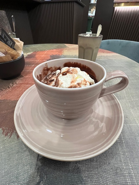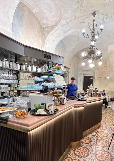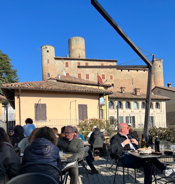 On the way home we called into La Visione to check an email booking David had made; just as well – Saturday lunch was full so instead we booked for our final Langhe night – Sunday. We then headed into Alba to test the apartment check-in arrangements for the next day, which was already very busy. The small streets made parking impossible, so we defaulted to the spaces opposite I Castelli, crawling through the homeward-bound traffic of which Alba has masses. We tracked down the little traditional café Teatro near San Domenico (sadly ‘improved’ and expanded) for a restorative cioccolata con panna