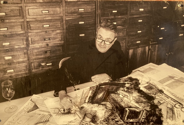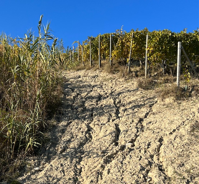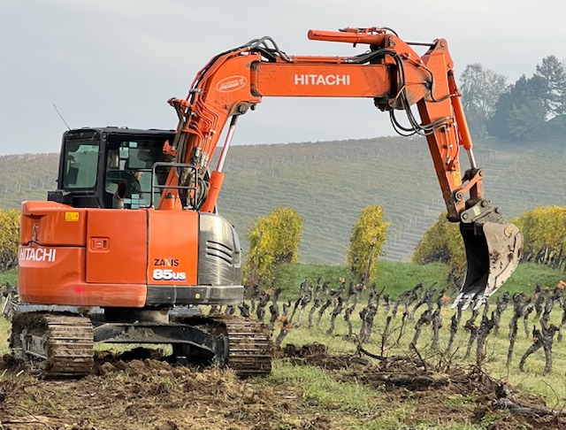 Today David’s research to support the vintages work began in earnest with a 09.00 visit to Paola at Sordo where their winemaker Gian Luca Colombo also joined us. (He tells us that his sheep are performing well, and that yes, they are now efficiently fenced). We drove down the narrow road alongside the Monprivato vineyard, stopping to capture the grubbing up of less important vines.