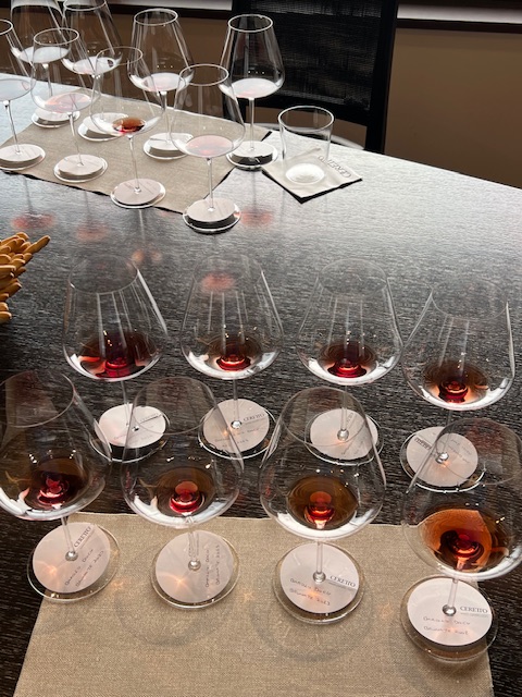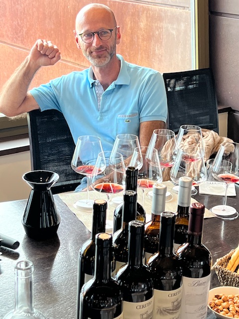 Our appointment was with Giovanni Gaia; we were admitted and greeted by Giulia, a friend of Valentina. After a brief wait we were shown into one of the decorated first floor rooms where Giovanni had assembled a fine selection of back vintages. David also quizzed him on the 2023 season, gathering information on this year’s weather, and the vineyard as well as cantina management.