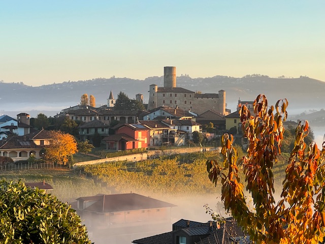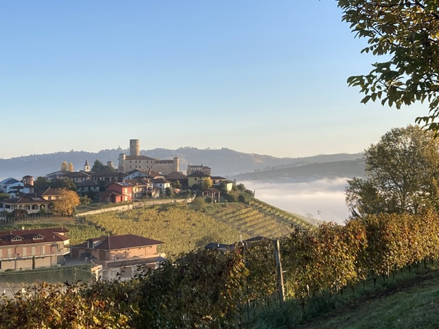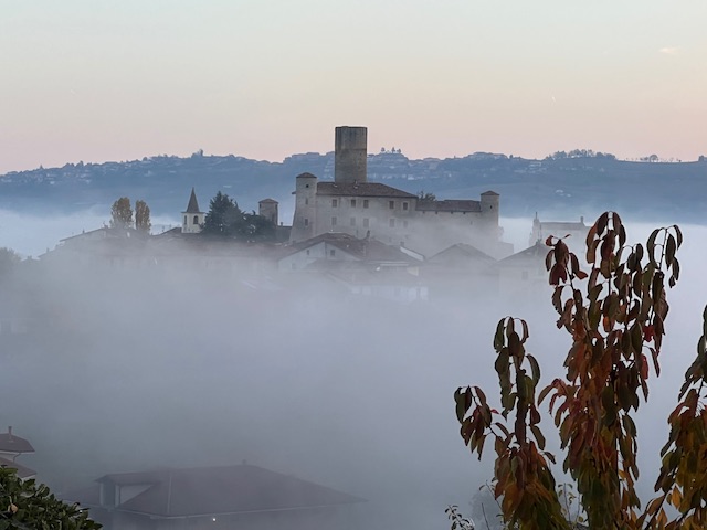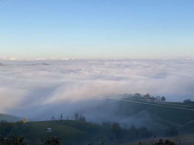 We woke to see the extraordinary fog stretching like a cotton wool carpet from La Morra to SerraLunga with the alps peeping over the northern edge. It was mesmerising to see it slowly move to expose a glimpse of Castiglione’s tower, only for it to become submerged once again, imperceptively.