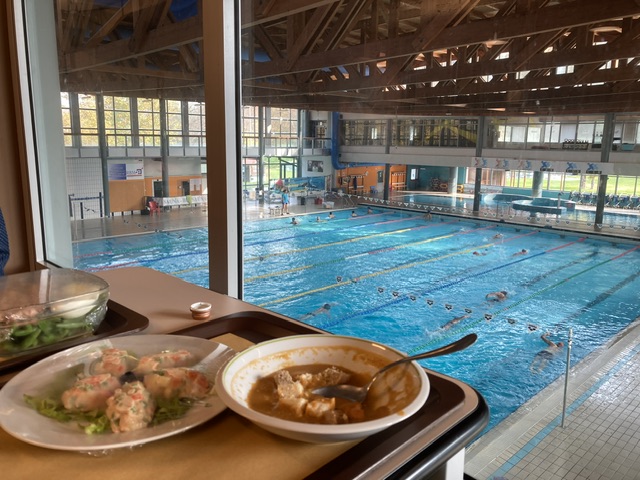 In pursuit of local food, we stumbled on Alba’s Sports Centre, and a small self service ristorante where we were politely instructed in the use of the obligatory if paper tovaglie for our trays, before being served vegetable soup and sundry other food, for a princely €10 each. We ate overlooking the earnest swimmers and exercisers in the pool below.