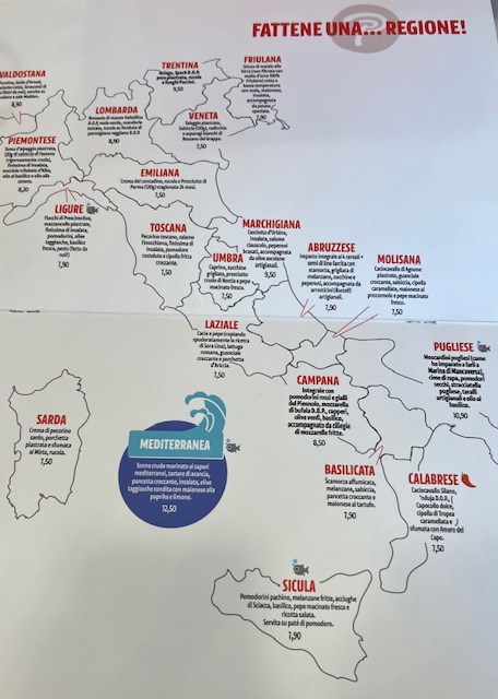 We ate in a well-placed piedini café which was doing great business, sited almost opposite the Palazzo piazza, where electrical workers were demonstrating, almost outnumbered by carabinieri. The choices were regionally described – as the photo of the menu shows: