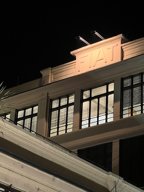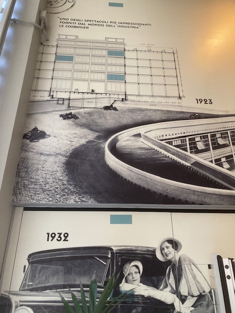 I quote from Wikipaedia: ‘Construction of the building started in 1916 and it was inaugurated in 1923. The design by the young architect Giacomo Matté-Trucco, was unusual in that it had five floors, with raw materials going in at the ground floor, and cars built on a line that went up through the building. Finished cars emerged at rooftop level to go onto the 1.5km long test track. It was the largest car factory in the world at that time’