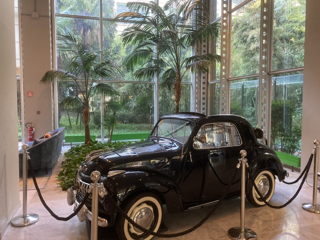Our room was ready, so we unpacked before having lunch in the very competent, busy and improbably-named hotel restaurant Torpedo. When we came to choose from the menu del giorno we realised the various names of each meal referred to makes of Fiat cars; so no doubt Torpedo has a place alongside Giulietta, and Topolino and Fluvia. Indeed in the foyer of the hotel stands a very handsome 1952 vintage 500C Trasformabile (convertible – very sweet indeed)