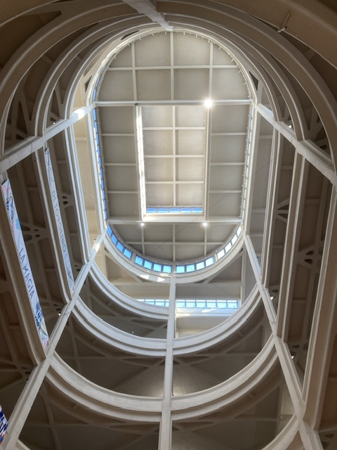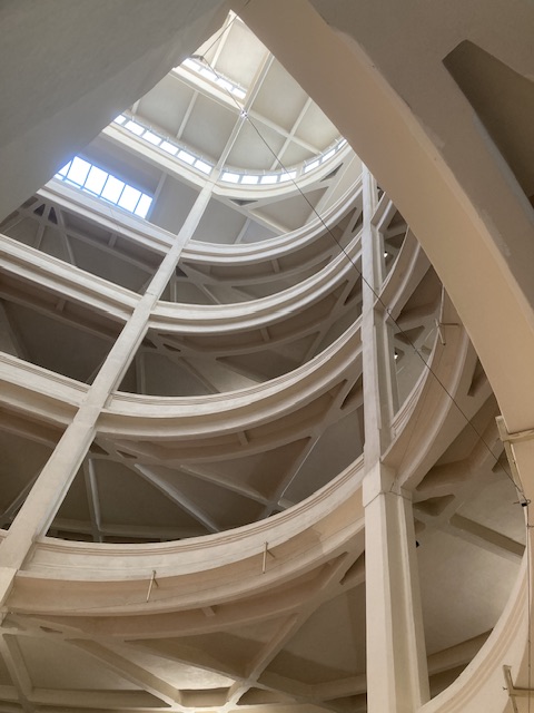 As the original FIAT car factory, opened in 1923, it employed thousands over the years and was in use until the early seventies, when it was superseded by an out-of-town factory, and stood empty and neglected until the massive restoration and repurposing in 1989 by architect Renzo Piano. It is a huge building. The spiral ramp which still runs up the height of five floors to the very top of the building is breath-taking. The testing track remains on the roof, open to the sky, encircling the gallery designed for the family’s fabulous collection of twentieth century art.
