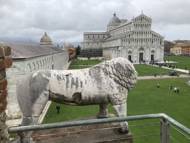 We had another good lunch, and sauntered around the Piazza dei Martiri before David and I took Olive and Ernest up to the Campo dei Miracoli again, approaching from a different angle, and paying attention to the fabulous stone, the colours, the surfaces and the carving, before tackling the city walls….