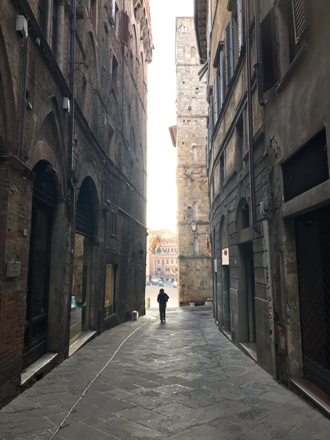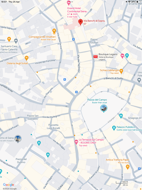 The bus from Grosetto tipped us out at 15.00, only a ten minute walk from our next apartment, in 57 via Banchi di Sopra, which follows the route of the old pilgrim way to Rome, the Francigena, directly into the extraordinary Campo – the heart of this fascinating medieval city.