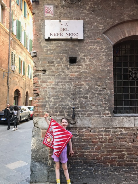 Initially I had equipped both children each with a postcard of the flags, but the grown-ups quickly realised that nothing would take priority over our actually visiting each district in turn. They all have their own special symbol – mostly animals, real and mythical (including a two-headed eagle and a unicorn) and the odd shell; and each one is displayed, in one way or another, in each contrada. Locating the different contrade and hunting the symbols made great entertainment for children. We walked for miles!