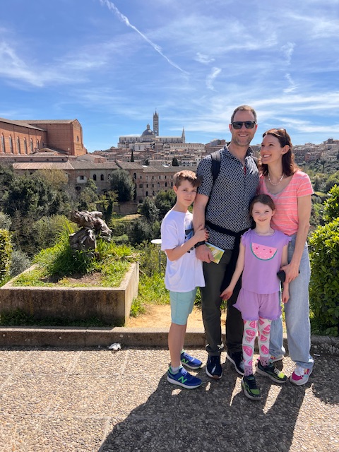James and Ernest tackled the Torre at 11.30, David went shopping, while Lucy, Olive and I tried to relocate a quiet ristorante Il Pomodorino we’d walked past yesterday. It took us ages, despite it being near the Alma Domus, a former convent in which Catherine of Siena had lived, and now a hotel where David and I had stayed a few years ago.