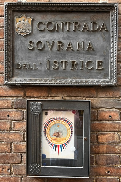 We inspected the course, astonished at the tight corners and camber, which the compressed sand doesn’t entirely improve. Lucy researched the very complicated process by which horses are trained and selected, and then allocated (by lots) to each competing contrada or district. We even learned that only 10 of a possible 17 contrade can compete. The seven who don’t compete automatically have a place next time. Very serious stuff …
