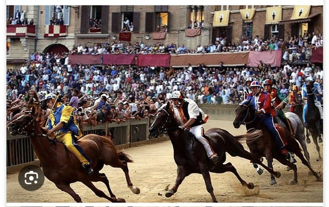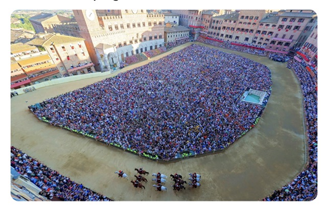 I had already explained the Palio to Ernest and Olive, the horse race held every year on 2 July and 16 August in the Campo, and even watched U Tube clips of last year’s race, with its inevitable collisions and chaos. (The following photos are dodgy screenshots taken from the clips…)