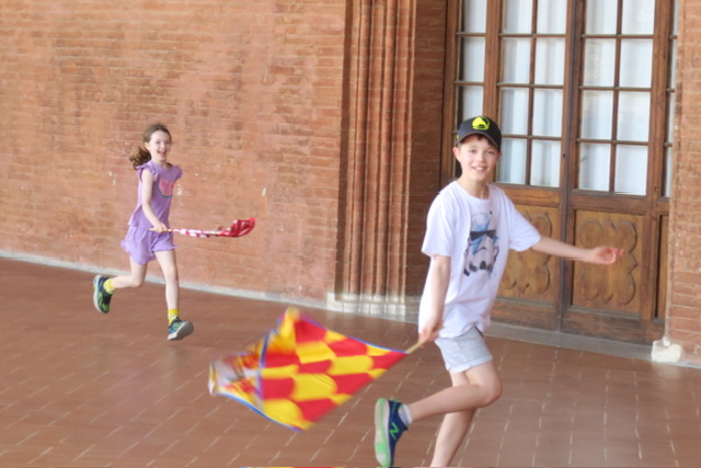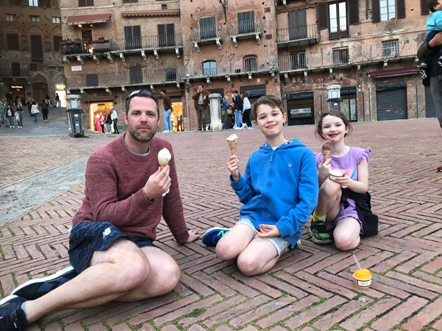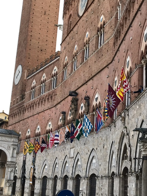 Finally, after a spot of desultory packing, the family headed out for an early evening in the great Campo, listening to the many sounds (including house martins) and consuming yet more ice cream, and admiring the contrade flags now adorning the Town Hall, before returning to the apartment, for pasta and bed.