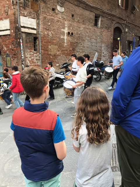 Likewise, the Cathedral’s exquisite interior, the Baptistry and the extraordinary Maestà by Duccio will need another visit. We were running out of steam, but while strolling around amongst the crowds we came upon several little bands, processions, and flag waving rehearsals, warming up for a mini event.